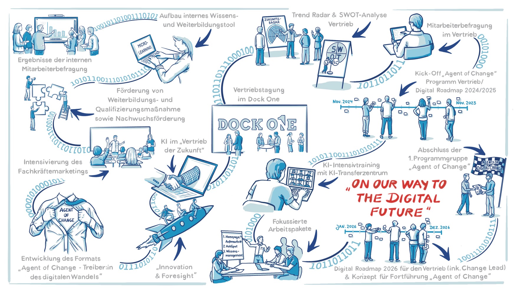 Seit einiger Zeit begleiten wir die digitale Transformation und das "Agent of Change" Programm von Schauenburg Industrietechnik. Der erste Jahrgang aus dem Vertrieb des Unternehmens hat im Januar 2026 seine Abschlusszertifikate erhalten. Ausgewählte Stationen unseres bisherigen Weges finden sich in der unteren Illustration.