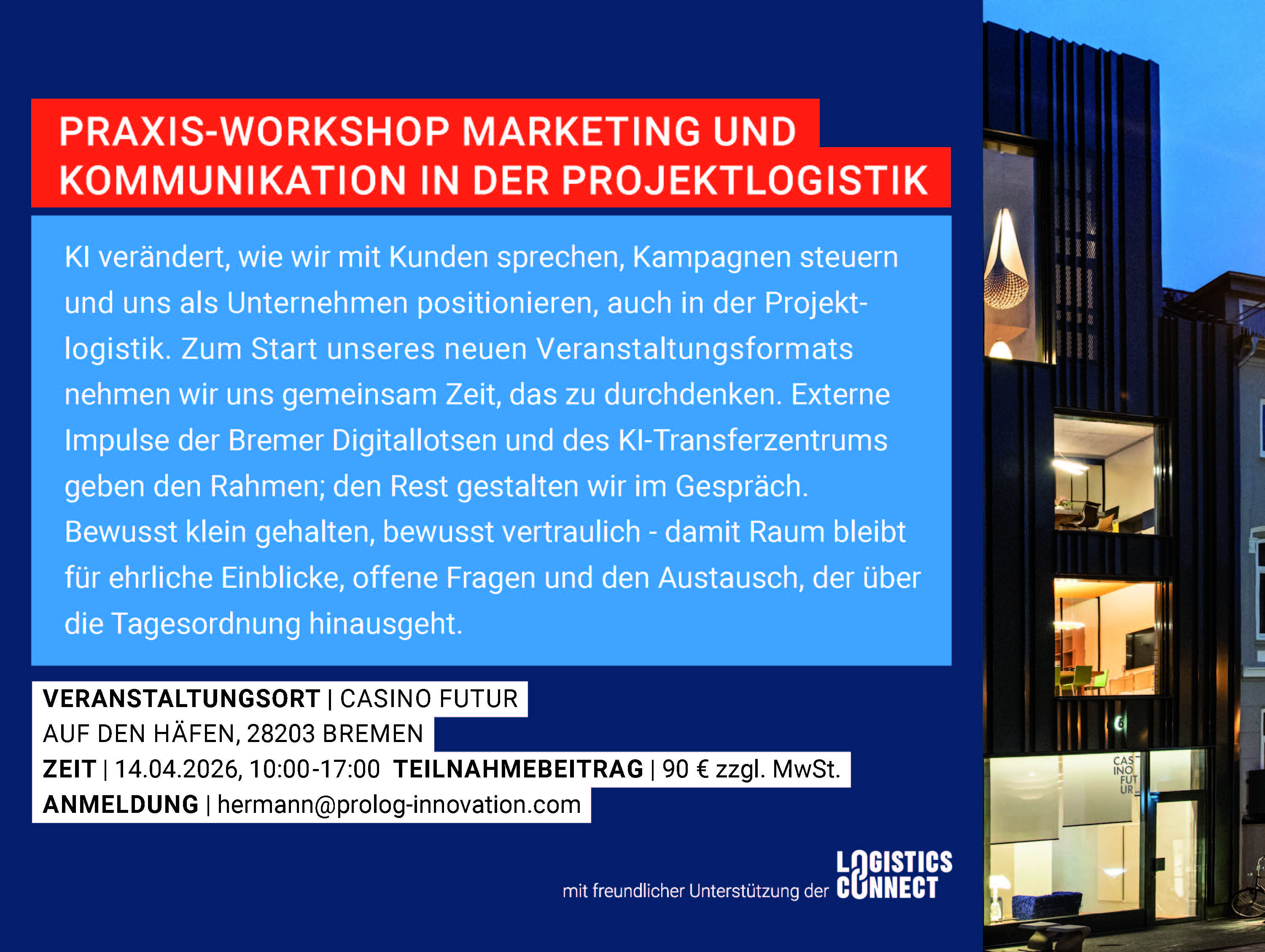 Am 14. April 2026 organisieren wir erstmalig den Praxis-Workshop "Marketing und Kommunikation in der Projektlogistik" im Bremer Casino Futur.