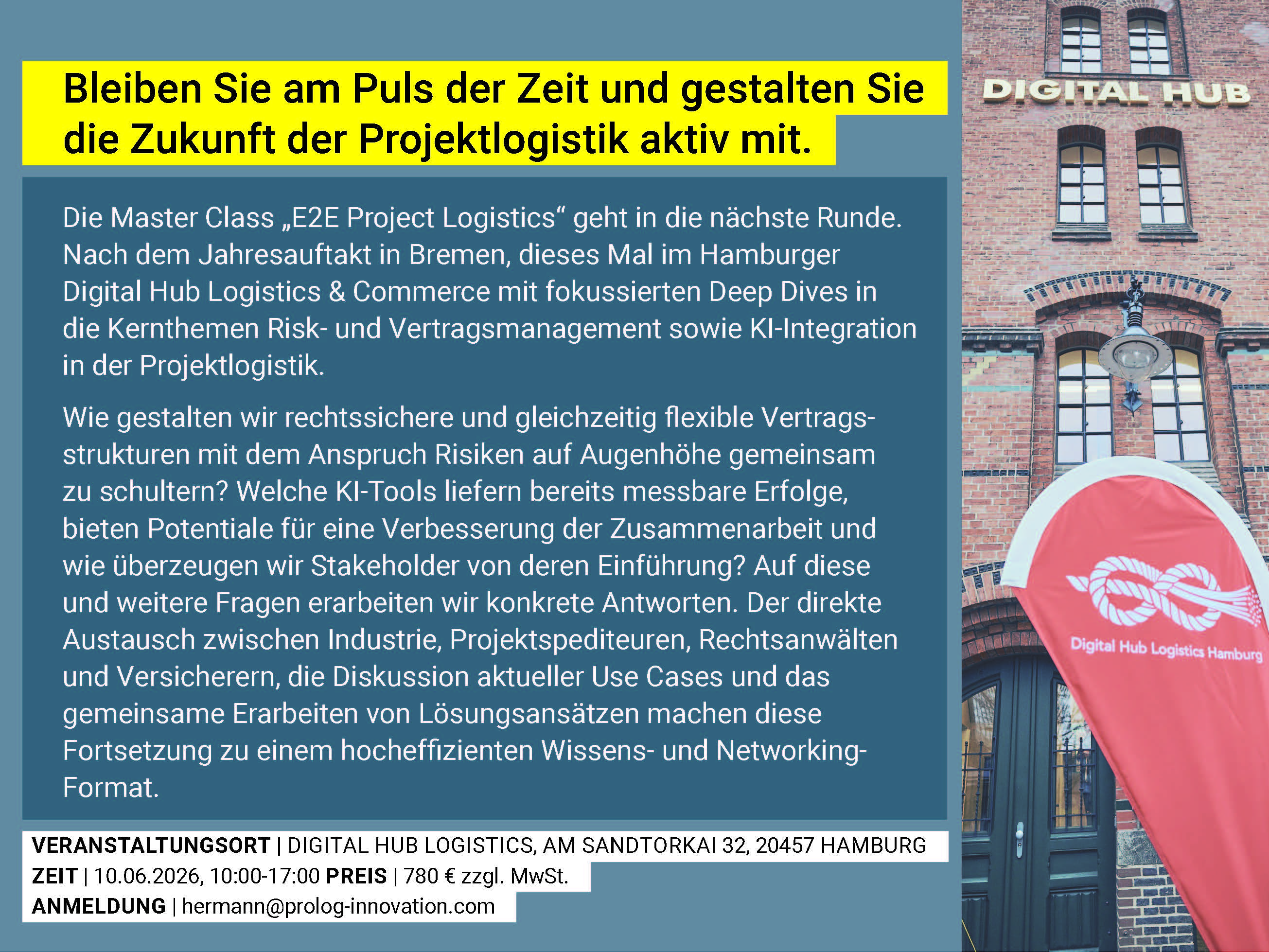Diskutiere mit Expert:innen über wichtige Trends, Technologien und Marktaussichten. Entwickle in einer exklusiven Gruppe aus Industrie- und Logistikunternehmen ganzheitliche Optimierungsansätze und innovative Ideen für eine zukunftsweisende End-to-end Transformation. Wertvolle Einblicke, intensiver Austausch und der Ausbau des eigenen Netzwerkes - gemeinsam gestalten wir in der Master Class Reihe die Zukunft der Projektlogistik.